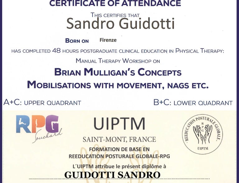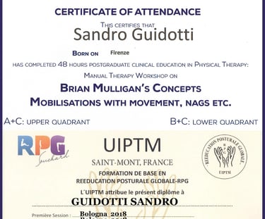 Fra il 2018 e il 2019 mi dedico alla formazione, specializzandomi in terapia manuale secondo il metodo Mulligan e conseguendo il diploma in Rieducazione Posturale Globale (RPG).